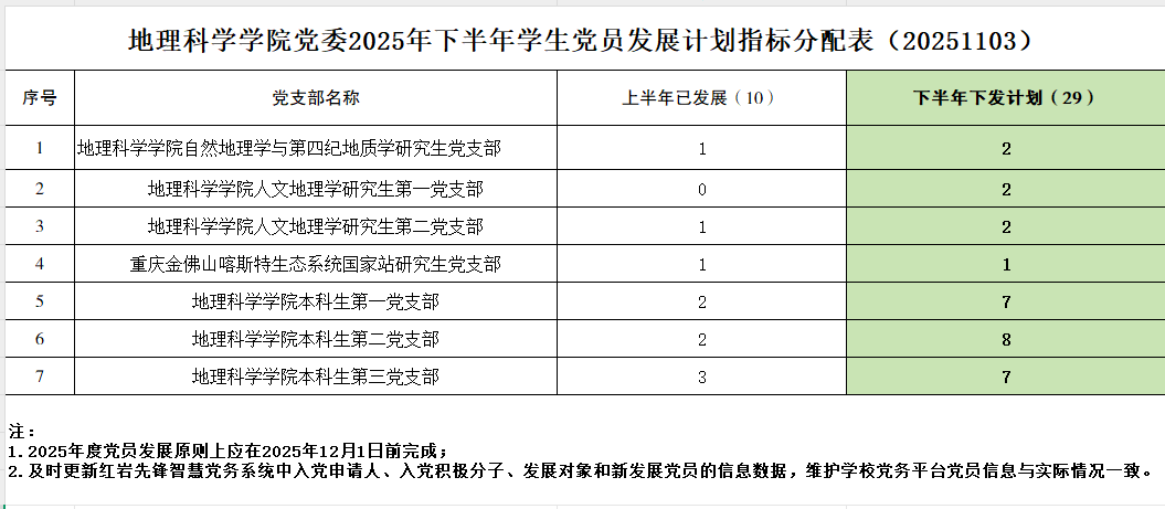 地理科学学院党委2025年下半年学生党员发展计划指标分配表